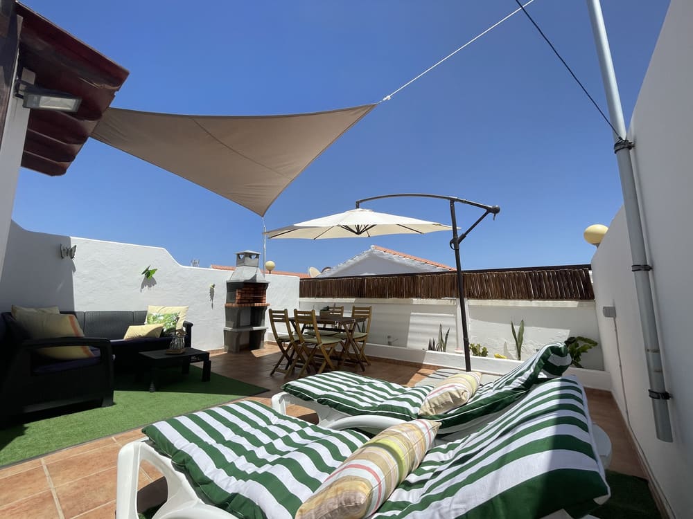 En su magnífica terraza privada encontrará una barbacoa de piedra con comedor exterior donde pueden comer hasta 4 comensales bajo una gran sombrilla. Salón exterior de rafta con cojines y a la sombra. Solarium con césped artificial y magníficas tumbonas acolchadas.