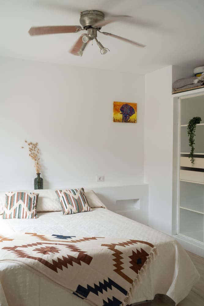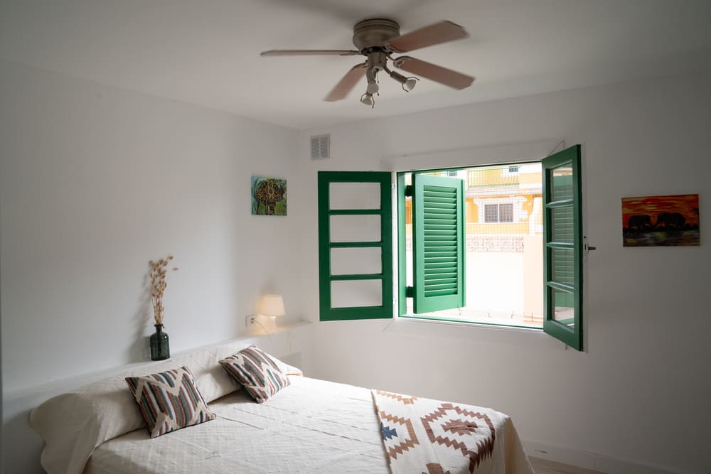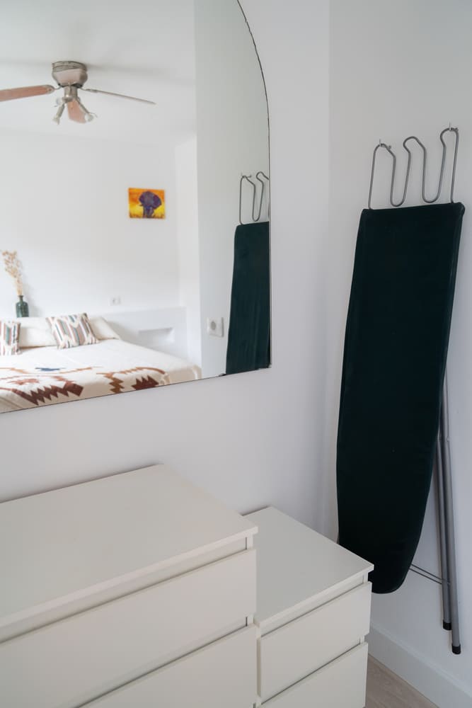La habitación dispone de ventilador de techo y persianas oscurecedoras para un plácido descanso. Un armario donde guardar sus cosas y 2 cómodas bajo un gran espejo. Podrá encontrar plancha y tabla de planchar.