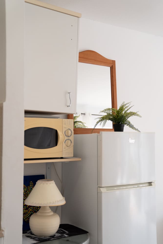 La cocina cuenta con 2 fogones y los elementos necesarios para cocinar en ellos, microondas y nevera con congelador. Dispone de pequeños electrodomésticos como tostadora, hervidor de agua..