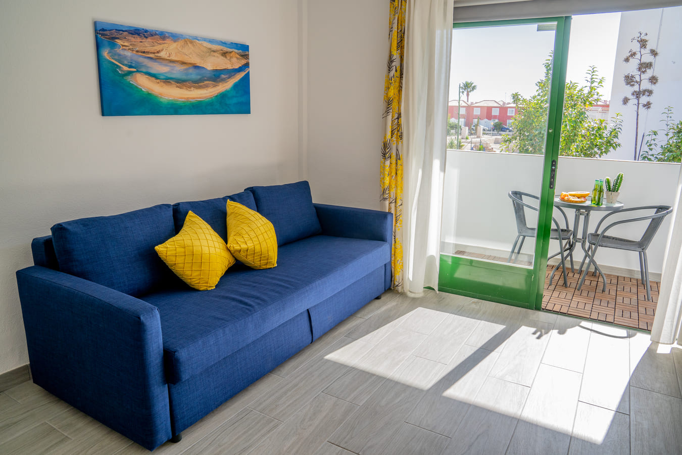 Salón- cocina con balcón vista sur (soleado hasta el final del día), con mesa y sillas para disfrutar de un almuercito al sol.