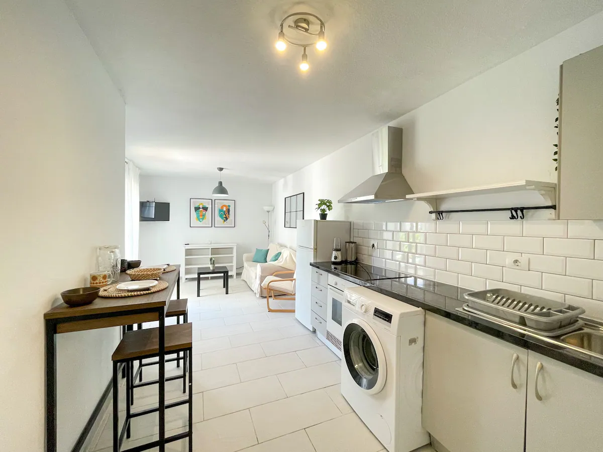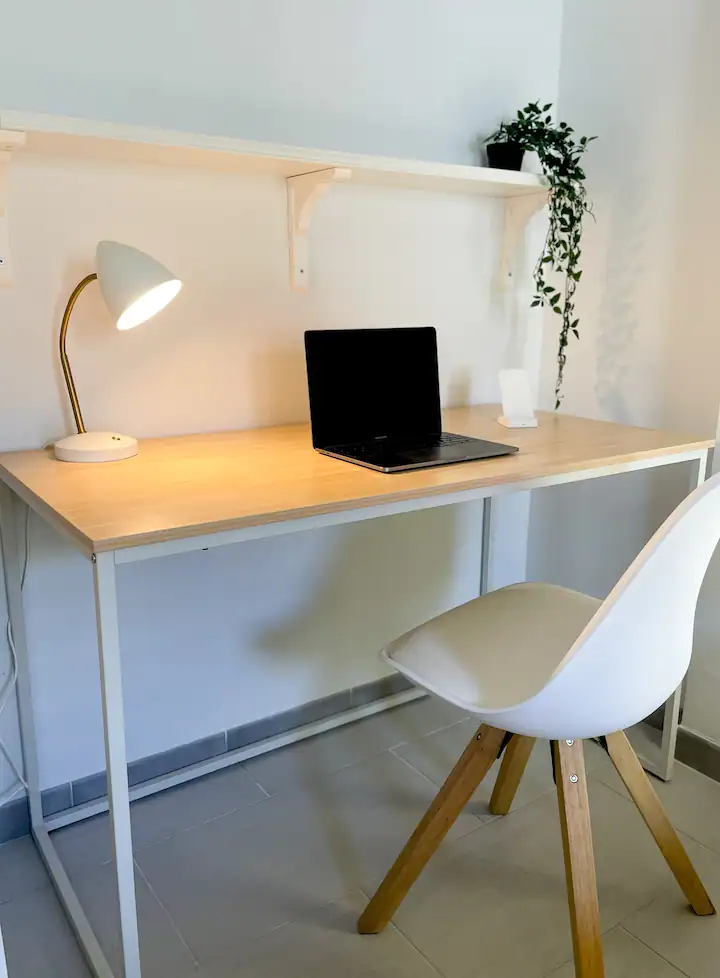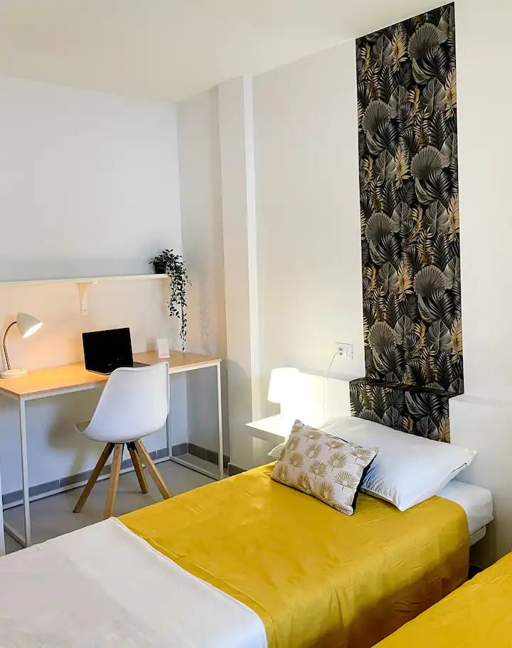 Apartamento de 1 dormitorio con 2 camas individuales y zona de trabajo, perfecto para nómadas o trabajadores remotos.