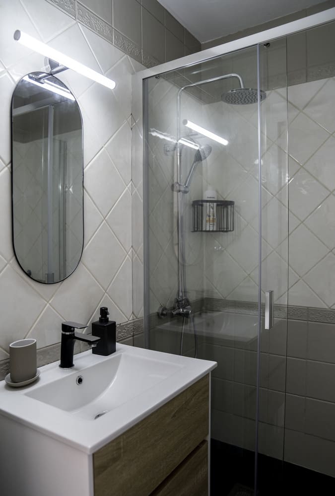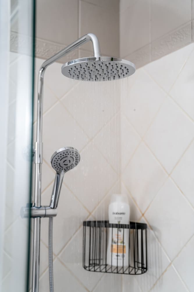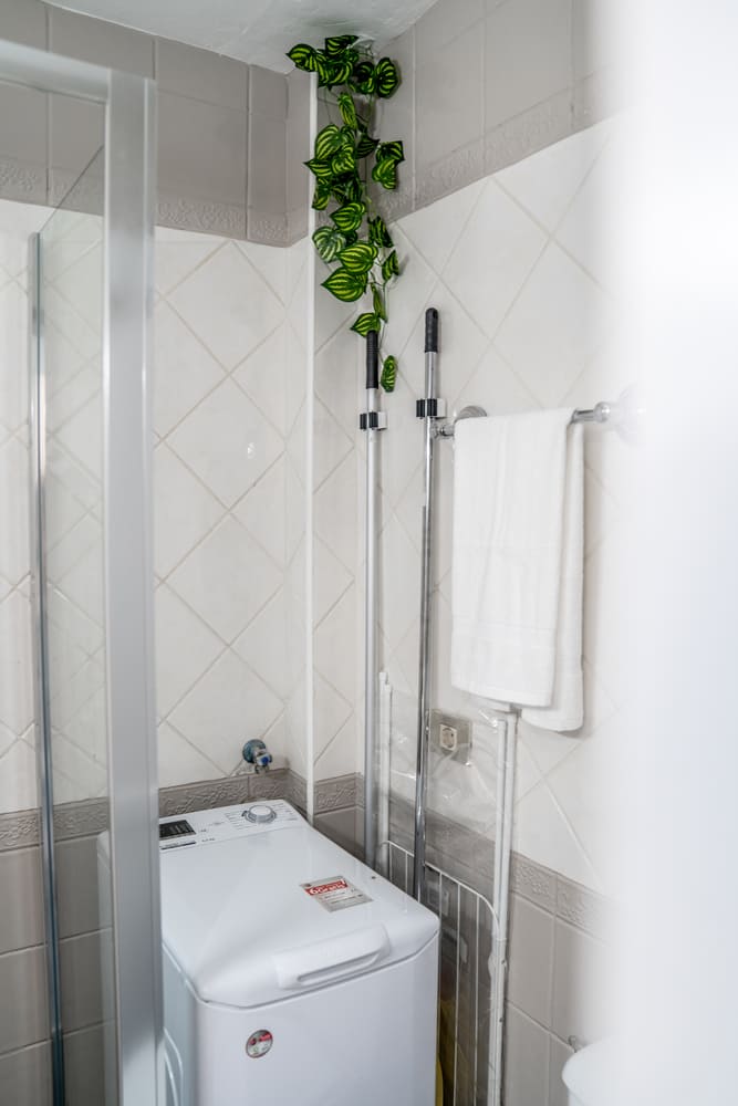 El baño tiene ducha italiana y una pequeña lavadora para el uso de los huéspedes.