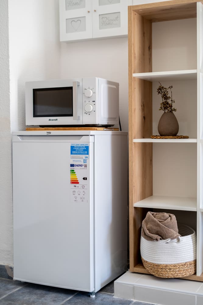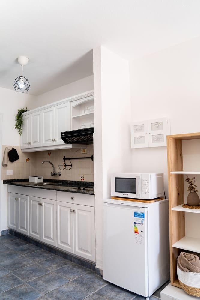 La cocina completamente equipada cuenta con cafetera, tostadora, licuadora y elementos básicos para cocinar (ollas, sartenes, cazos..), además de un kit de bienvenida con sal / aceite / agua y tés. Vitrocerámica con 2 fuegos, microondas y nevera con un pequeño espacio de congelación.