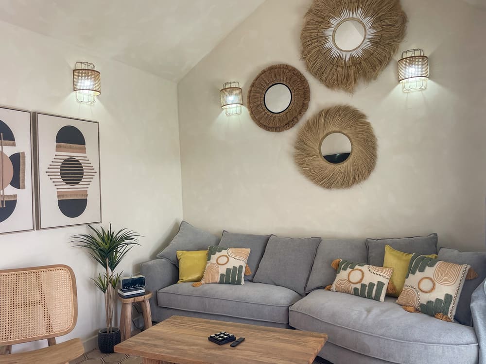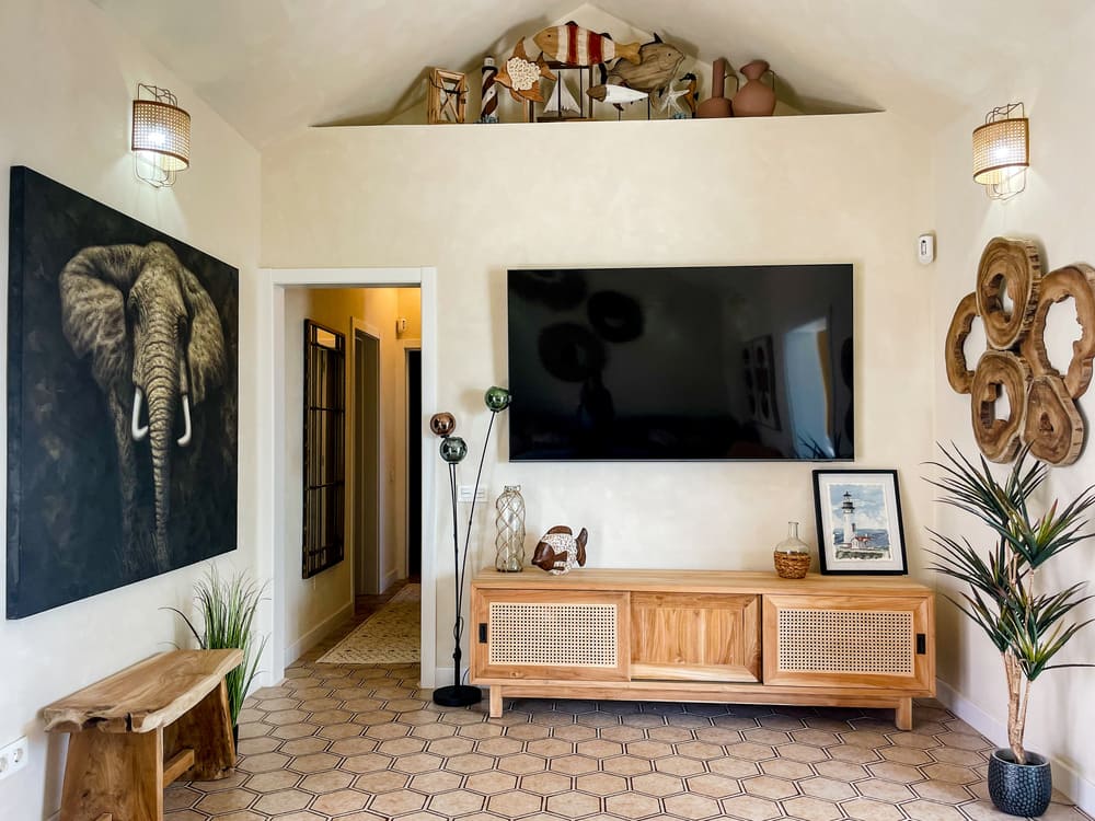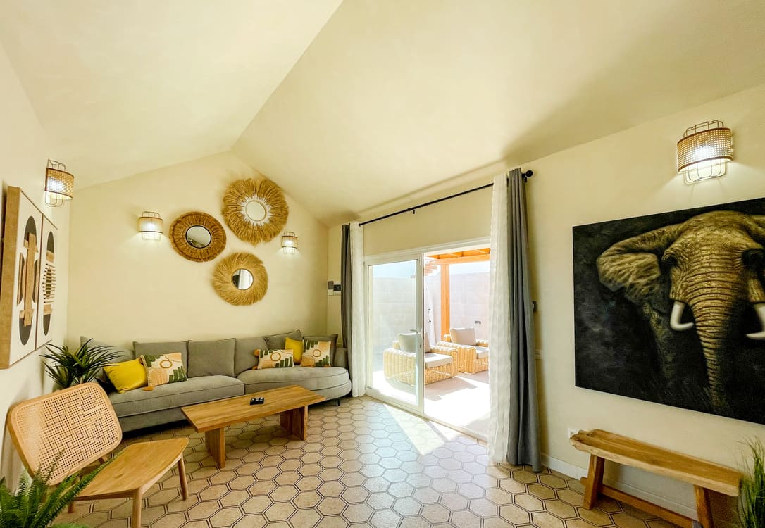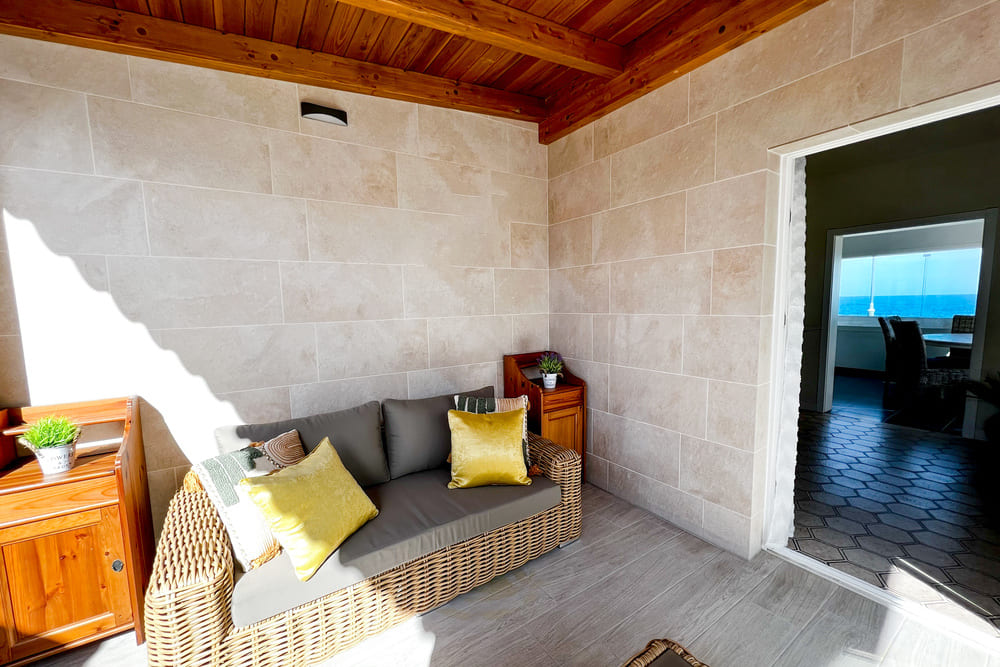 Al entrar en Villa del mar se encuentra con un salón exterior bajo un porche de madera, donde disfrutará hasta los últimos rayos de sol gracias a su orientación sur.