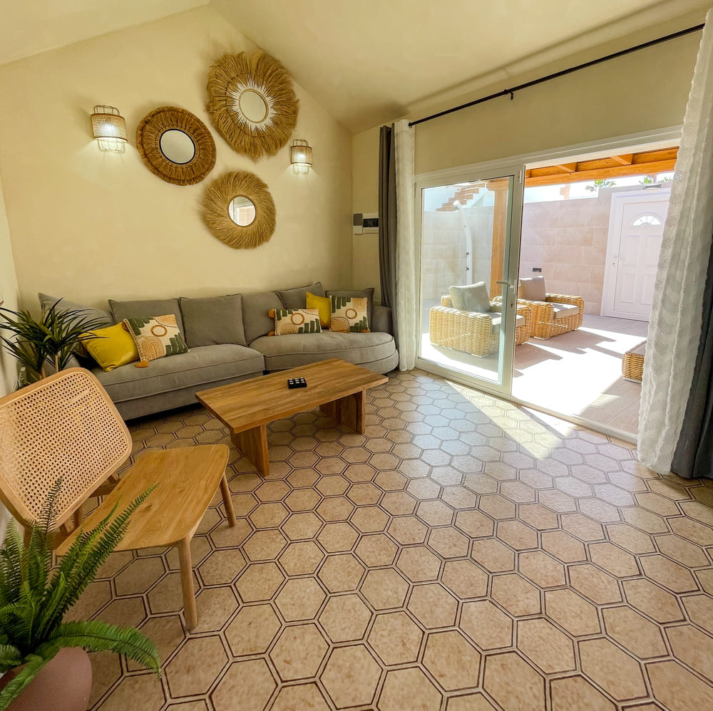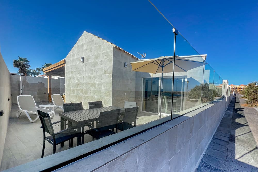 La villa es completamente independiente y cuenta con dos accesos, uno desde el paseo peatonal y otro por la avenida del Castillo, a solo 5 minutos a pie de la zona de ocio de Caleta de Fuste.