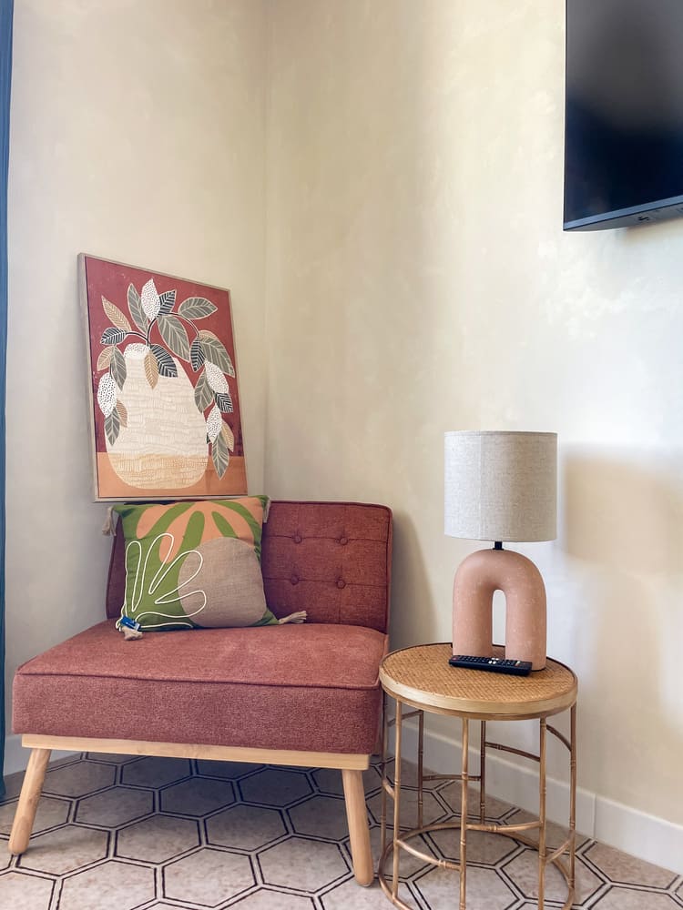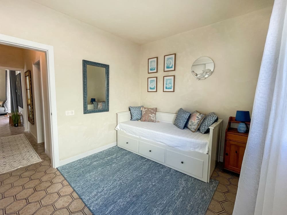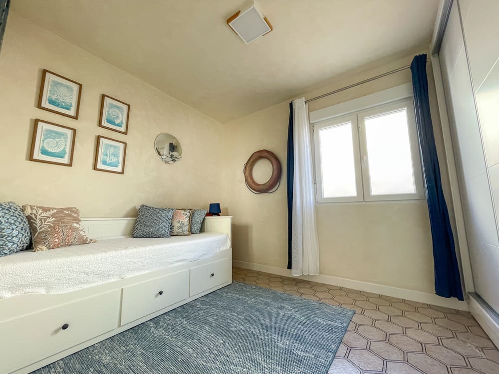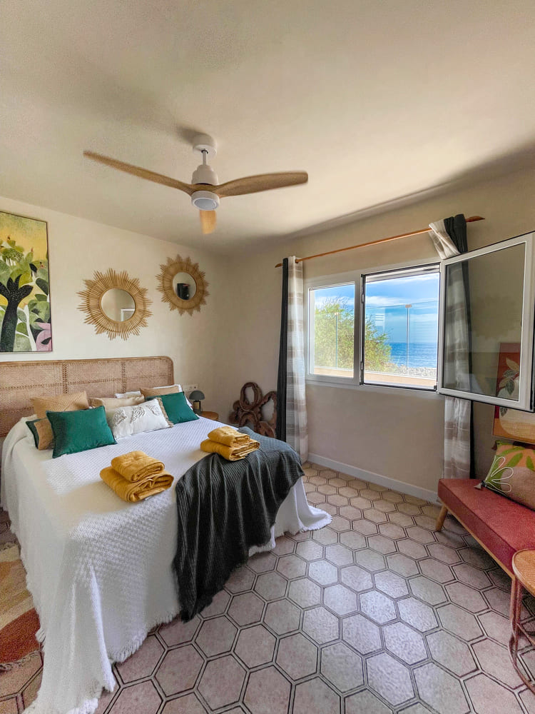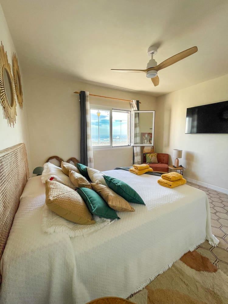 La habitación principal tiene vistas al mar, prácticamente desde la cama, queen size, ventilador de techo, persianas oscurecedoras para el descanso nocturno. Cuenta con una Smart TV de 40″.