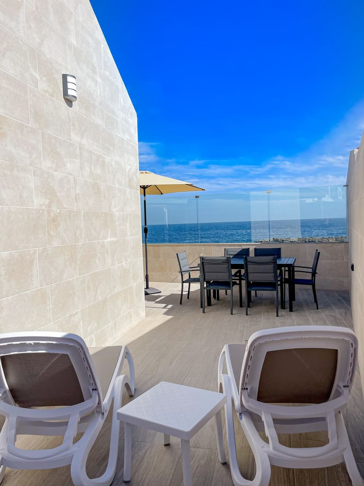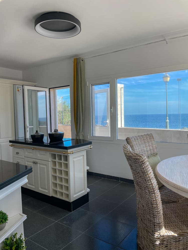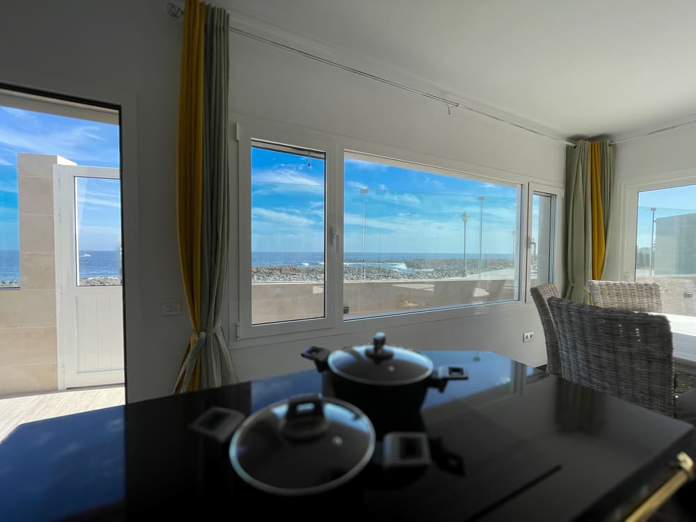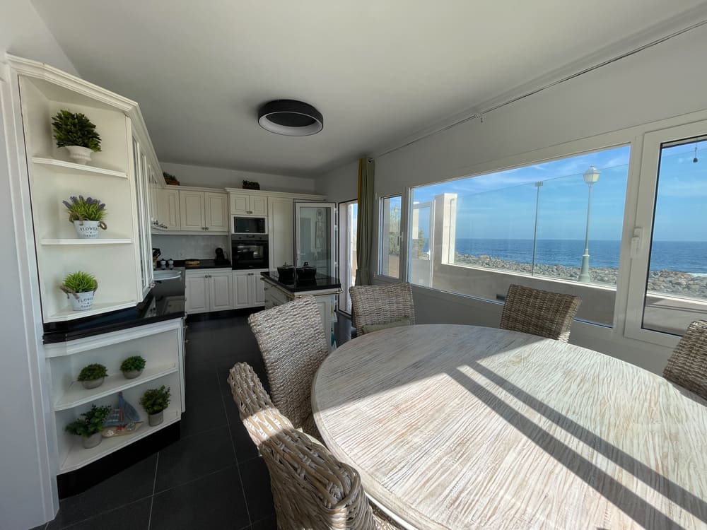 Desde ahí accede al amplio salón con vistas al océano directamente. Dispone de smart TV de 60”, gran sofa de hasta 5 plazas. Cocina-comedor semi abierta al salón con vistas panorámicas al océano. El gran comedor redondo permite ver el mar en todo momento gracias a sus grandes ventanales a ambos. Desde ahí puede acceder al comedor exterior de hasta 6 comensales, una sombrilla extra grande y vistas en primer plano al océano.