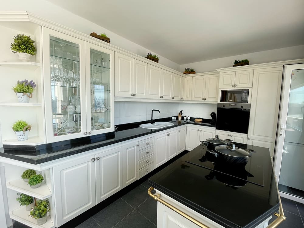 La cocina está perfectamente equipada con 4 fogones, horno, microondas, y toda clase de pequeños electrodomésticos como hervidor, tostadora, cafetera de filtro, de cápsulas. Elementos básicos como sal, aceite, especias…