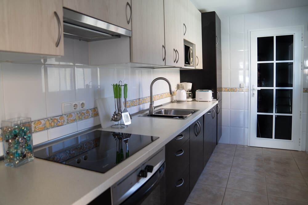 La cocina está perfectamente equipada con 4 fogones, horno, microondas, lavavajillas y toda clase de pequeños electrodomésticos como hervidor, tostadora, cafetera de filtro para hacer una estancia más cómoda.