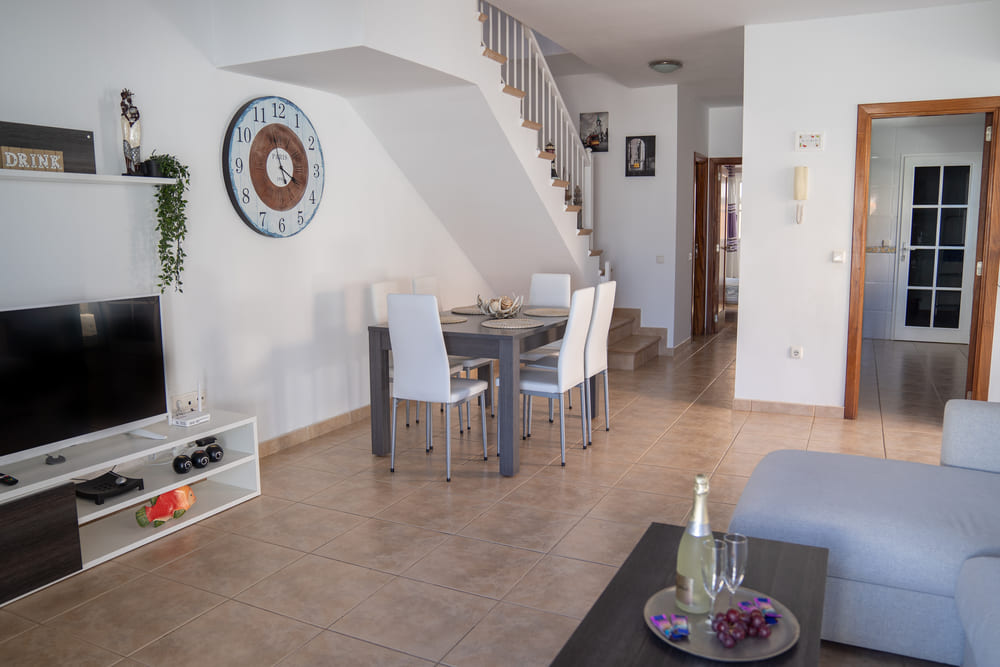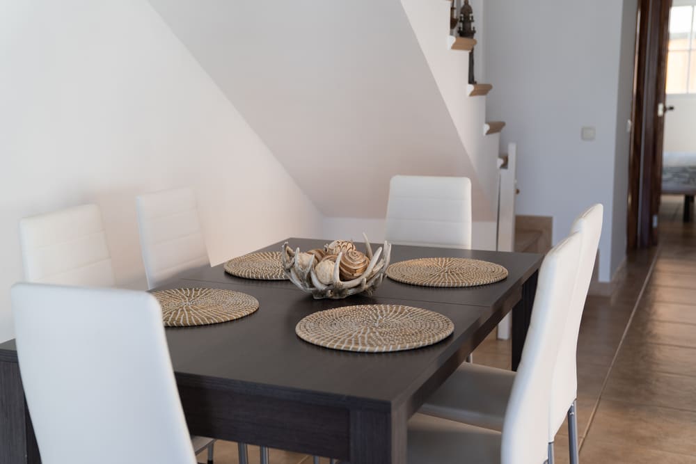 El salón comedor con mesa hasta seis comensales, tiene acceso directo a la terraza y la zona exterior de la vivienda.