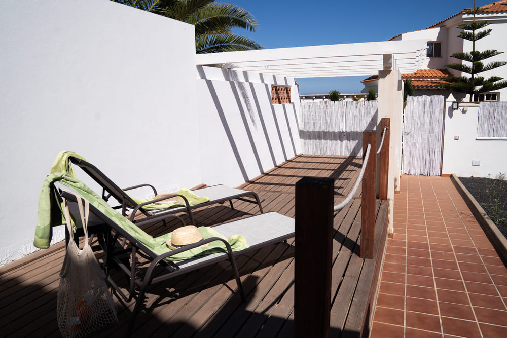 El exterior tiene una tarima de maderas con hamacas para tomar el sol. Una mesa comedor bajo la pérgola y una zona ajardinada.